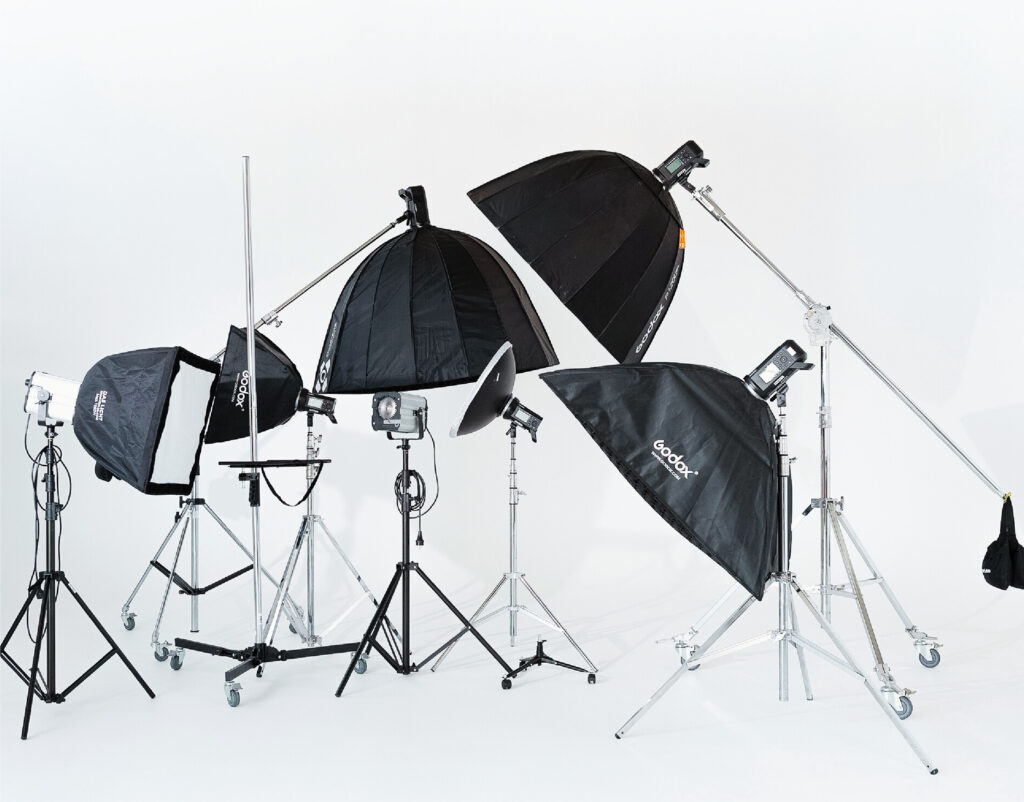 Šioje salėje rasite studijines blykstes bei nuolatinės šviesos lempas.