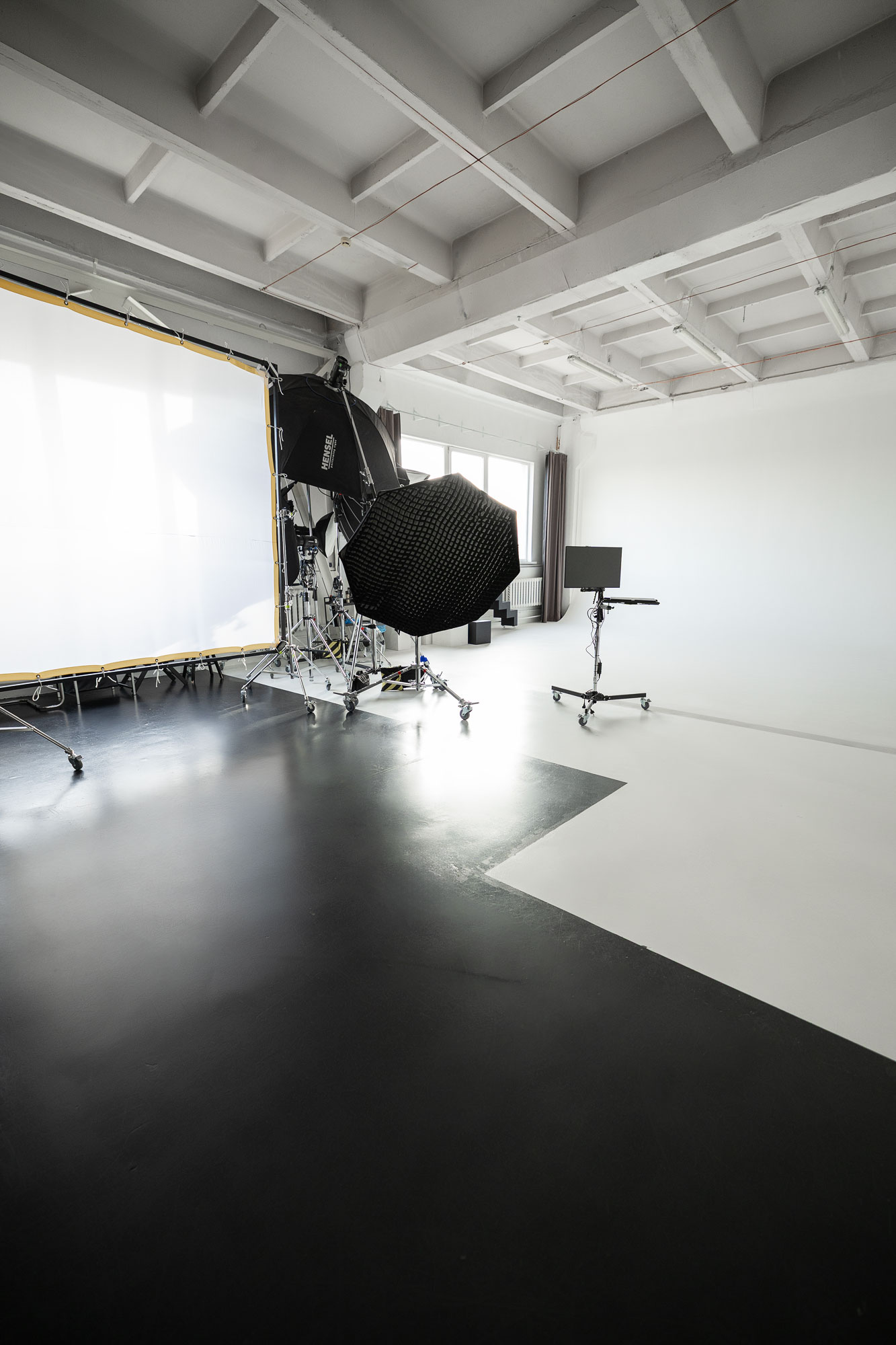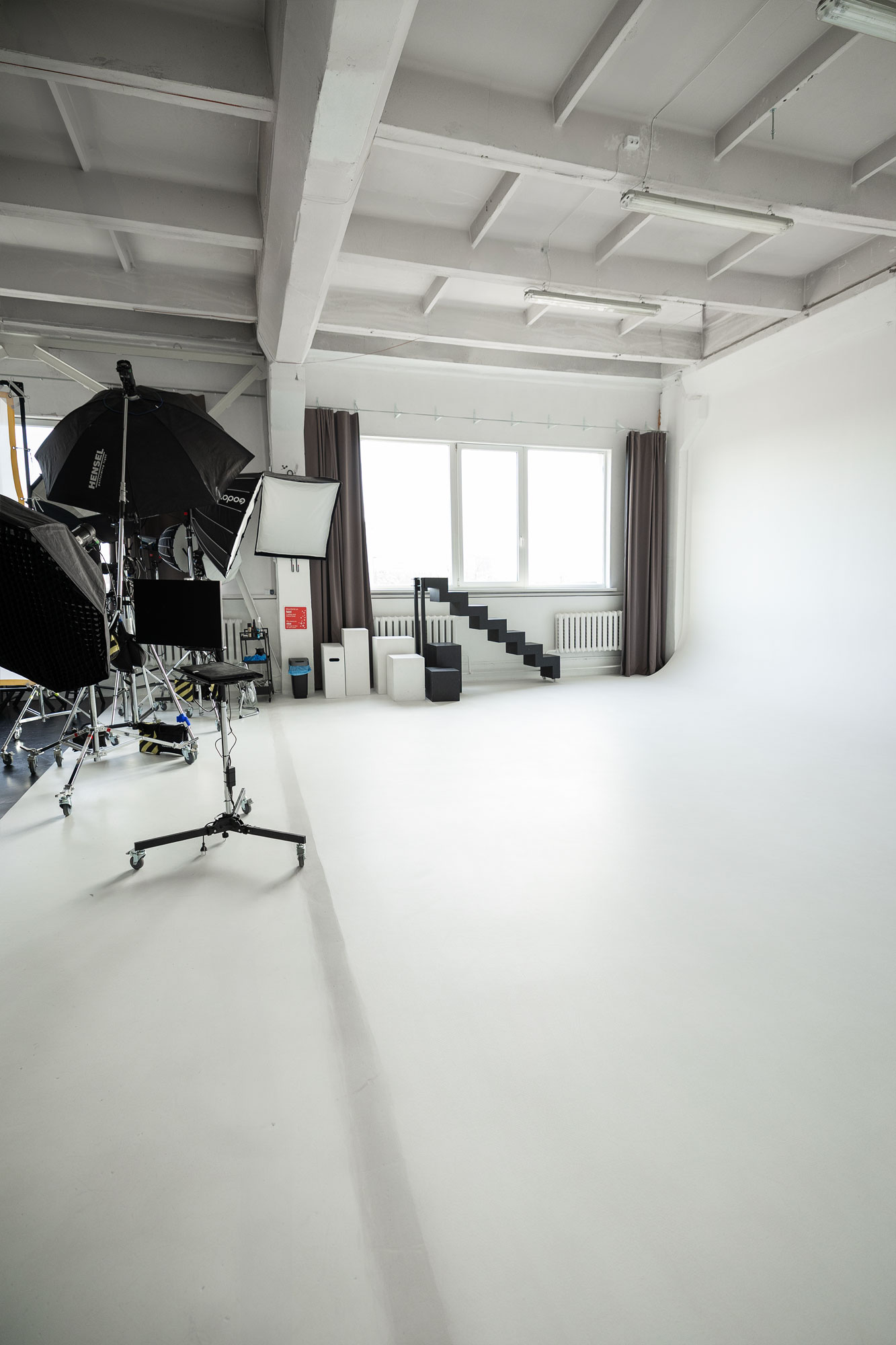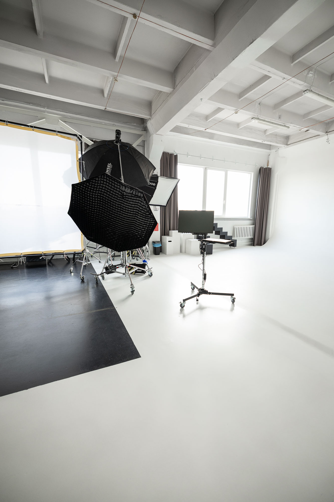 • 54 m2 kampinė balta ciklorama